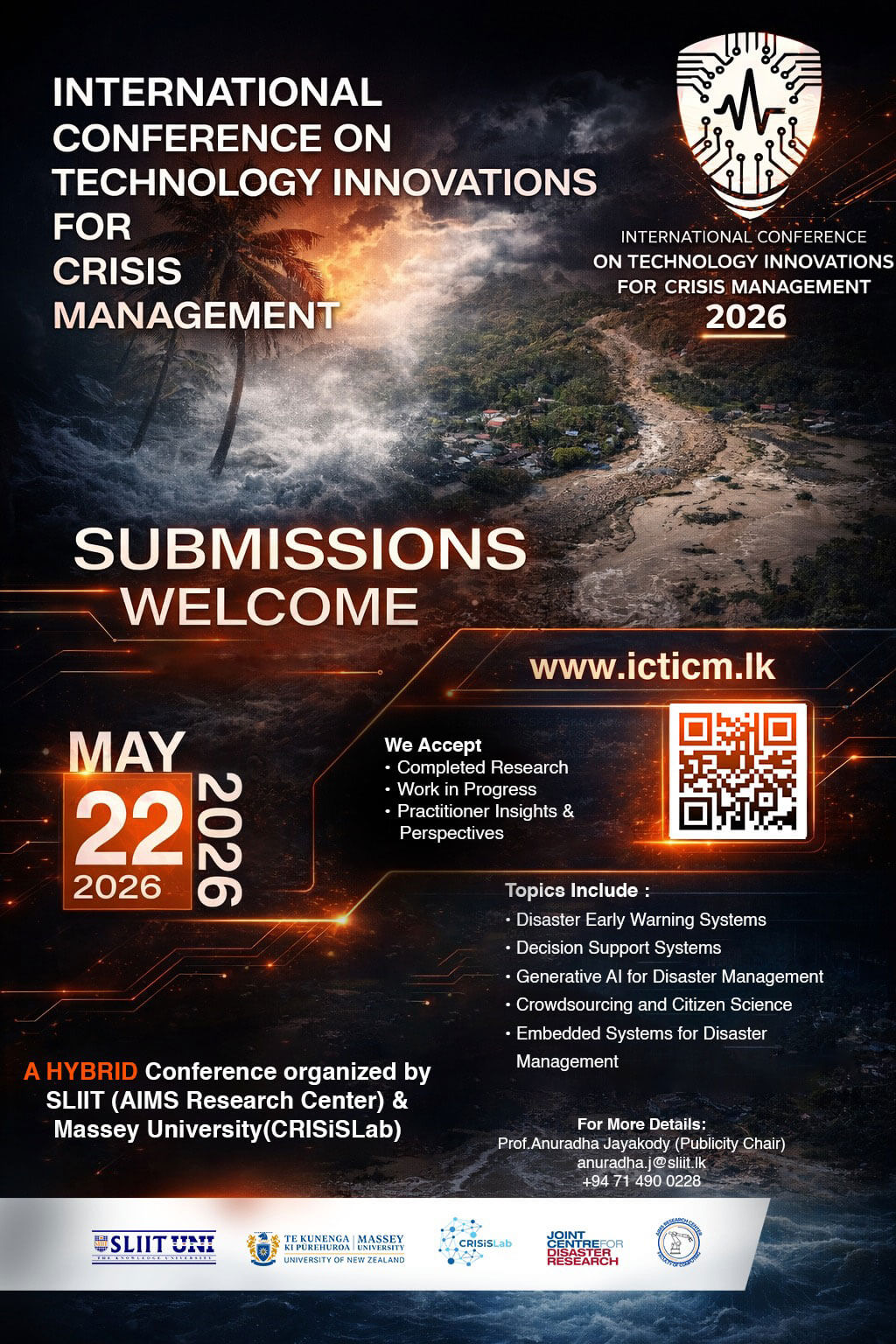 “We are pleased to announce the International Conference on Technology Innovations for Crisis Management (ICTICM 2026), a hybrid international conference jointly organized by SLIIT (AIMS Research Center) and Massey University, New Zealand (CRISISLab).