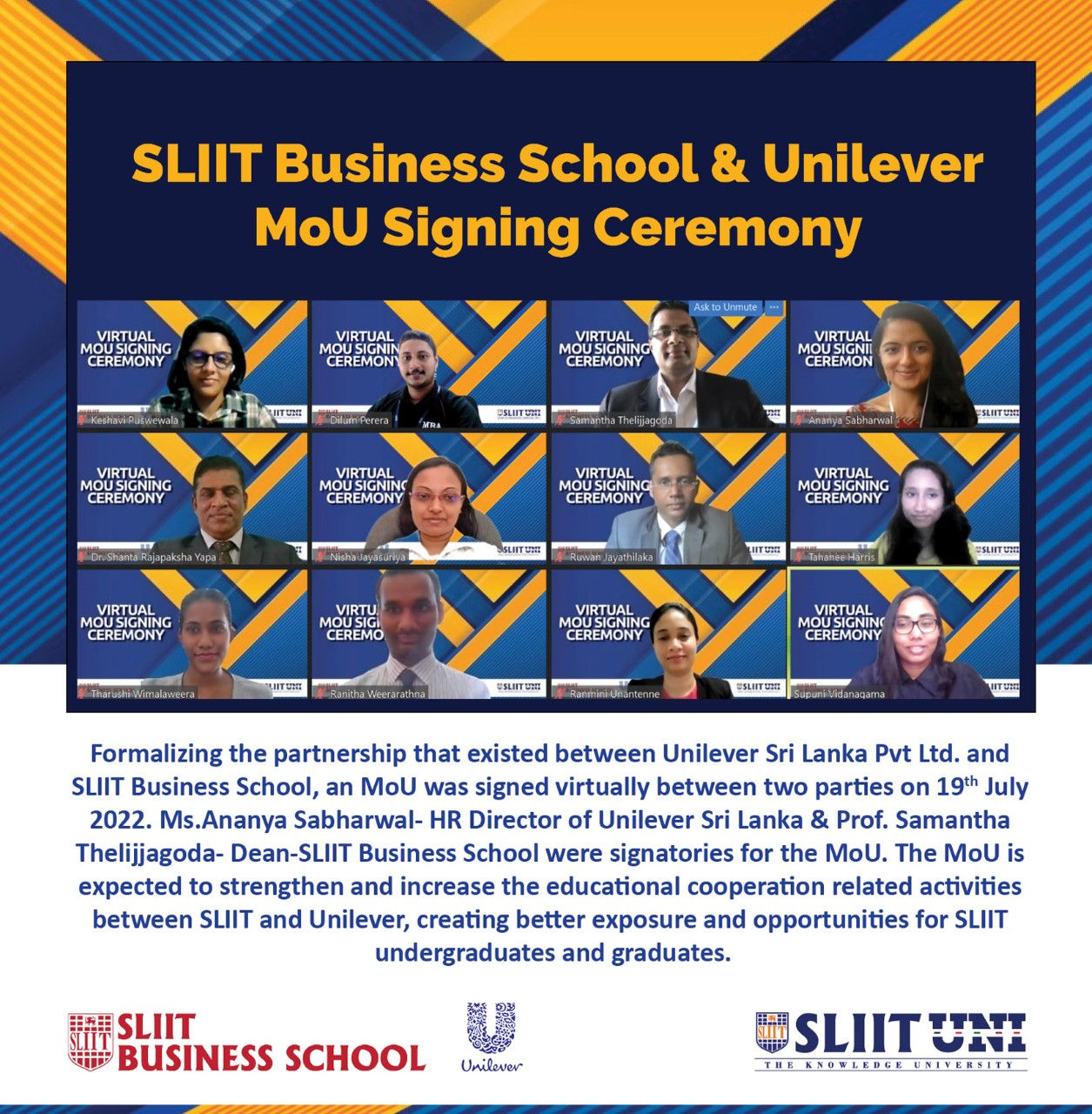 Formalizing the partnership that existed between Unilever Sri Lanka Pvt Ltd. and SLIIT Business School, an MoU was signed virtually between two parties on 19th July 2022. Ms.Ananya Sabharwal- HR Director of Unilever Sri Lanka & Prof. Samantha Thelijjagoda- Dean – SLIIT Business School were signatories for the MoU.